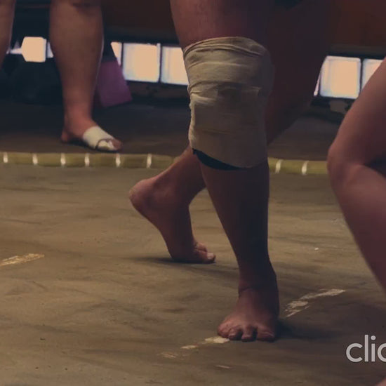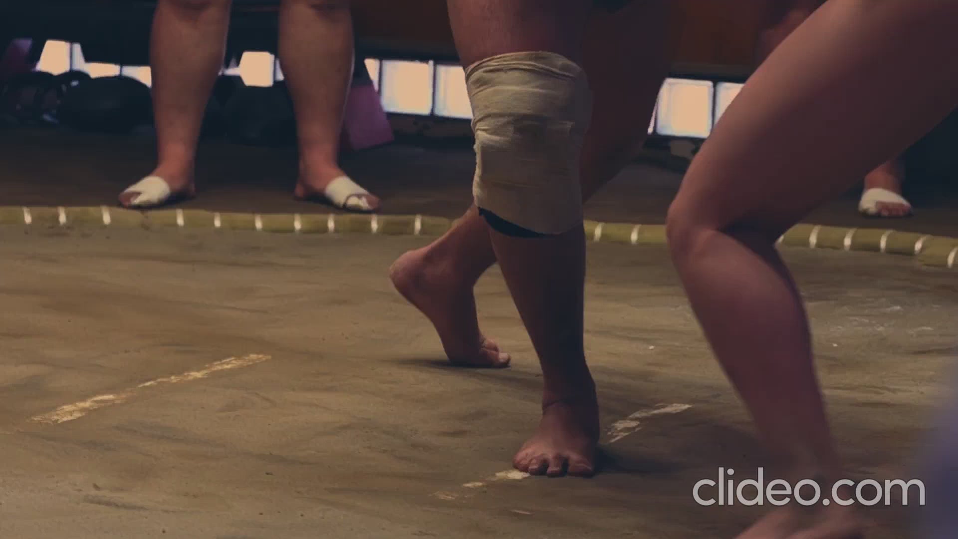Watch a demonstration of authentic sumo training, famous techniques (kimarite), and an intense one-round match (tachiai) between retired sumo wrestlers.